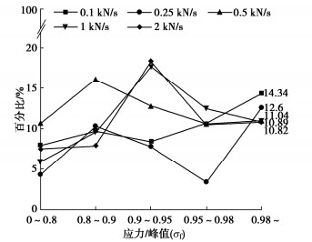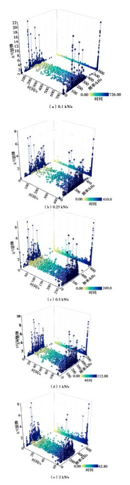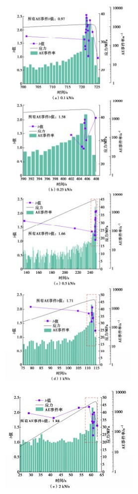 b-value indicate that the specimens have a sudden failure instability propagation, and the large- and small-scale fractures are alternately generated during this process. (3) At the steady loading stage, the high loading rates make the AE activity of the specimens more intense, while the opposite is true at the near destabilization damage stages, and the low-frequency signal and large-scale fracture events account for a greater proportion under low loading rates. The difference in the speed of stress re-distribution due to different excavation schemes and construction methods in engineering is the cause of further damage in different modes after the occurrence of slab failure in the surrounding rock.