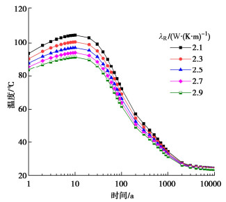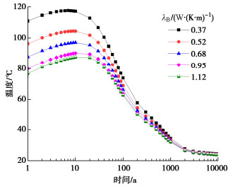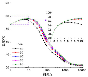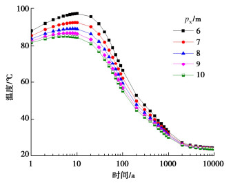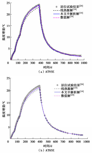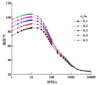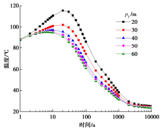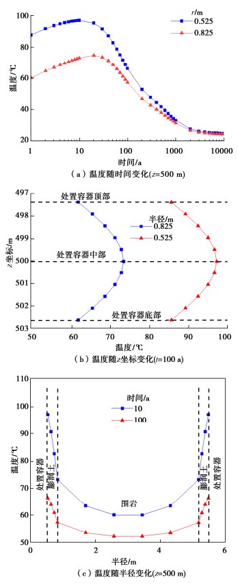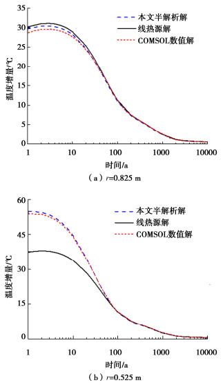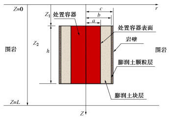 The long-term evolution of temperature field in high-level radioactive waste disposal repository is one of the important bases for the safety evaluation and design of buffer layer and the spatial optimization of disposal container. A two-dimensional axisymmetric thermal analysis model with two layers of disposal unit is established to reveal the near-field temperature evolution of multi-barrier system. The Laplace and finite Fourier sine transforms are applied to the governing equations for heat transfer to obtain the temperature solutions to the buffer layer and the surrounding rock layer in the Laplace domain. The corresponding solutions in time domain are obtained by numerical inversion of the Laplace domain solutions with the help of the Crump method. The correctness of the model is verified by comparing with the linear heat source solution and the numerical solution. The temporal and spatial distribution characteristics of the temperature field in the near-field multi-barrier system of the disposal unit are analyzed, and the effects of different parameters on the peak temperature of the buffer layer are discussed. The semi-analytical solution of the model is used to determine the minimum disposal container spacing and predict the results of the in-situ tests. The results show that the semi-analytical solution of the model can simulate the temperature change of buffer layer more accurately by comparing with the linear heat source solution. When the tunnel spacing exceeds 40 m, it has small effects on the peak temperature of buffer layer. When the tunnel spacing is 40 m, the container spacing is 7.7 m. The semi-analytical solution of the model can well predict the results of the in-situ test.
