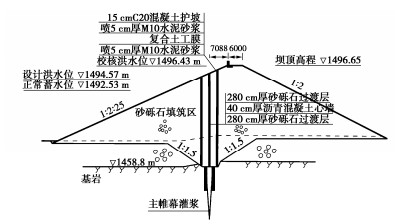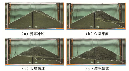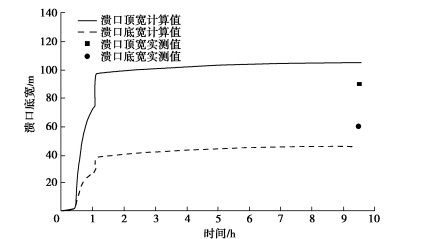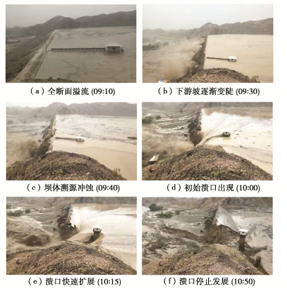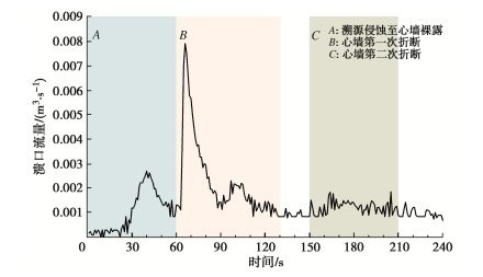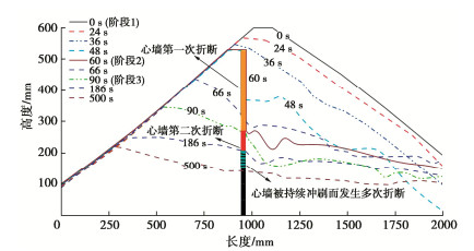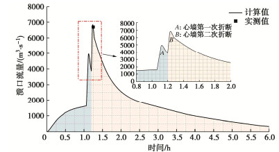 Based on the dam breach case data of Sheyuegou Reservoir in Xinjiang Autonomous Region of China, the model tests on overtopping-induced breach of asphalt concrete core dams are conducted in the flume erosion model test system, and the process of erosion of dam shell materials and bending of core walls is visually demonstrated. It is found that the asphalt concrete core with strong erosion resistance has important influences on dam breach process. The breach process of asphalt concrete core dams due to overtopping can be divided into three stages: retrogressive erosion of dam shell materials, the first fracture of asphalt concrete core until the occurrence of the peak flows, occurrence of multiple fractures of core wall until the stabilization of the breach morphology. Based on the breach model test results, a mathematical model is developed to simulate the breach flow discharge and the breach morphology evolution of asphalt concrete core dams due to overtopping. The highlights of the model are the simulation of the exposed length of asphalt concrete core by soil erosion formula, and the calculation of breaking time, breaking length, and number of breaking time of the exposed core wall by the moment balance method. Therefore, the coupling mechanism between dam shell materials and core wall of asphalt concrete core dams can be reflected reasonably during dam breaching. The mathematical model is used to conduct back analysis of the dam breach process of Sheyuegou Reservoir, and the calculated results show that the relative errors of important breaching parameters are within ±25%, which gives a good perfomance in dam breach modeling. The research results can provide reference for simulation of breach process of overtopping-induced asphalt concrete core dams.