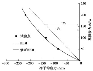 b=0. In order to consider the nonlinear change of model parameters with matric suction for unsaturated loess, a hyperbolic function is adopted to modify the BBM model. The modified model is verified, and the results show that the overall predicted results of the revised model are ideal, especially the predicted ones under low matric suction and low net mean stress are more ideal than those of the original model.