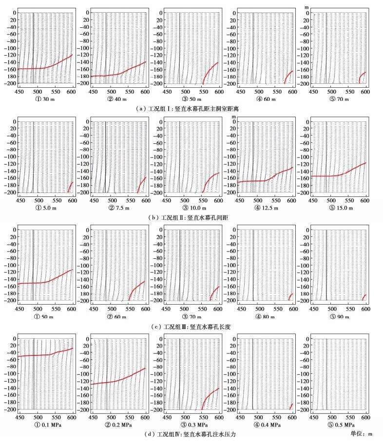 l) and hole injection pressure ( p_\texti ) of the vertical water curtain on the groundwater seepage field, water-sealed properties, water inflow and seawater distribution range around the cavern are obtained by using the finite element numerical simulation method and compared with the existing results for verification based on an underground water-sealed oil storage cavern in the coastal area. The research shows that the hole distance of the vertical water curtain from the storage cavern mainly has an impact on its burial depth range. The range of influences of the length depends on the location of the change beyond the storage cavern, and the spacing and injection pressure affect the entire depth range. The degree of influences of the four parameters on the water-sealed properties and prevention of seawater intrusion are as follows: