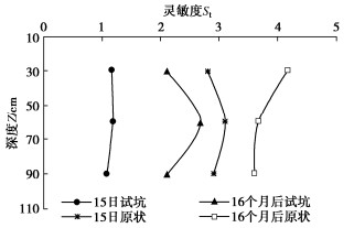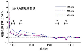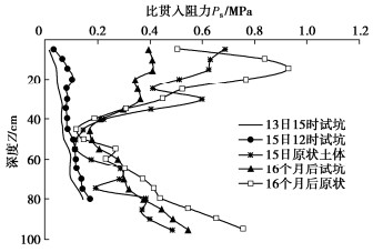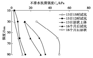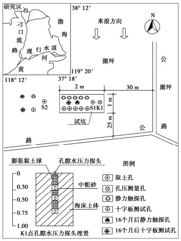 The sediments in the Yellow River estuary rapidly deposit in the estuarine area. Under the action of waves and tidal waves, the surface sediments are in an over-consolidated state. However, it is found that the pre-consolidation pressure of silty soils in the Yellow River estuary calculated by the Casagrande graphic method is usually too high. In order to find out the consolidation states and estimate the pre-consolidation pressure of silty soils reasonably, a series of tests are conducted on the tide flat of Diaokou delta lobe. The fluid sediments imitating the rapidly deposited seabed silts are made in situ, and then promptly filled into a one-meter deep pit excavated at the tide flat. Through the in-situ testing methods such as the static cone penetration tests, field vane shear tests and pore water pressure tests, on the basis of long-term observation, the consolidation processes and states of the undisturbed soils of the tidal flat and testing pit soils are studied in the range of 1.0 m in depth. It is shown that the consolidation speed of the rapidly deposited pit silty soils are very fast under the effective gravity stress, after consolidation compression is completed, the strength of such soils still increase unevenly with the development of time, exhibiting high-low-subhigh non-uniform consolidation characteristics along the depth. After 16 months, the pre-consolidation pressures of the undisturbed soils and testing pit soils further increase, the characteristics of non-uniform consolidation and structure are enhanced continuously. According to the actual consolidation states of the testing pit soils after the self-weight compression consolidation is completed and the indexes of physical and mechanical properties of the undisturbed soils, the results of the Casagrande graphic method are too great, so it is more reliable to estimate the pre-consolidation pressures of the undisturbed soils and testing pit soils by using the static cone penetration tests and field vane shear tests. Meantime such in-situ testing methods provide a new way to determine the consolidation states of soils.