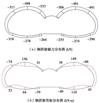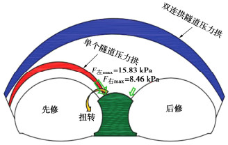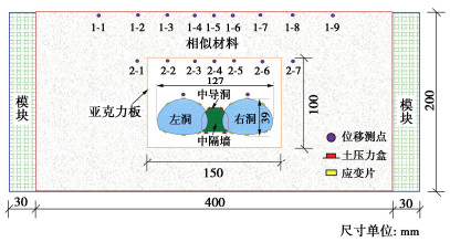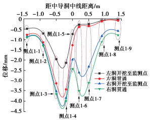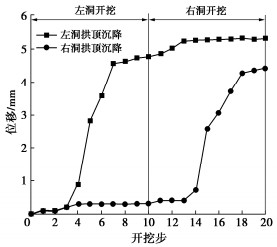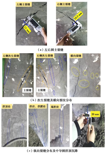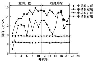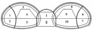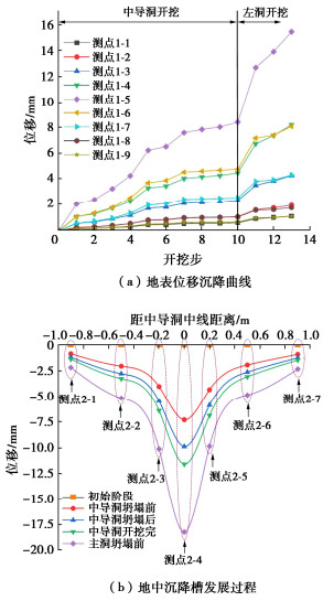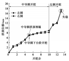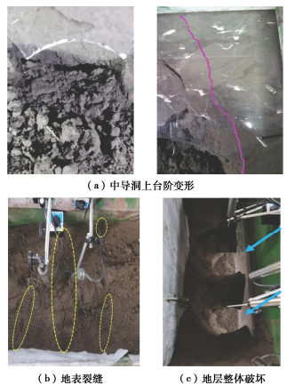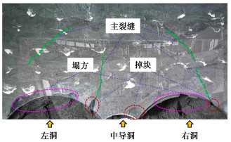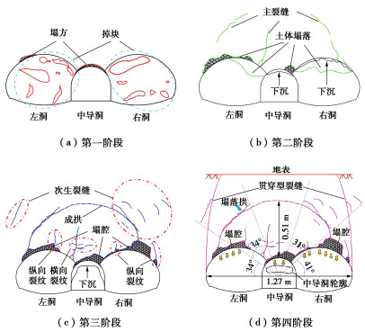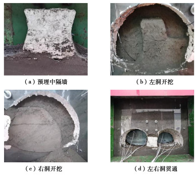 At present, there is no precedent of using the undermining method to construct large-section multi-arch tunnels in fly ash deposits in China, which brings great challenges to the design and construction of the tunnels. Based on the Yanpingba tunnel project, the laboratory similar model tests are carried out to explore the evolution laws of collapse arch and mechanical behaviors of excavation of the double-arch tunnel in fly ash stratum. The results show that the excavation of the multi-arch arch tunnels in the fly ash deposits is highly susceptible to instability, and the failure process is characterized by suddenness, intensity, symmetry and synchronicity. The height of the collapsed arch is about 0.4 times the excavation span of the tunnels. The bearing capacity of the fly ash deposits is seriously insufficient by using the single-side drift method, and the settlements of the left and right vaults are 16.86 cm and 14.91 cm according to the similarity relationship. It is necessary to implement grouting reinforcement for the stratum. The bearing effect of the partition wall can effectively reduce the displacement of the stratum, the shape of stratum settlement is 'bimodal', and the first-excavated tunnel is more affected by excavation than the following one. During the process of conversion from single-tunnel pressure arch to double-tunnel one, the partition wall is easily deflected to the side of the first-excavated tunnel under the action of bias pressure, so it is suggested to add supports to the partition wall in the first-excavated of the existing tunnel.