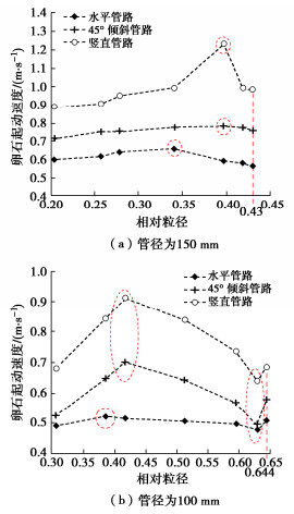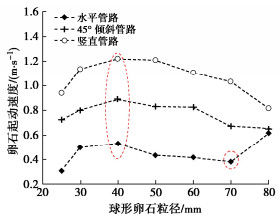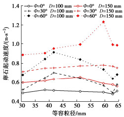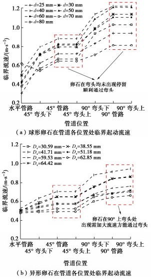 During the excavation process of slurry shield tunneling in sandy pebble stratum, the discharge pipeline transport is particularly complex due to a large number of irregular pebbles in the slurry-discharge pipelines. In this study, a circulating current test device is designed, and a three-dimensional transient numerical model is established using the computational fluid dynamics-discrete element method (CFD-DEM) coupling method. The start-up characteristics of the pebbles under different shapes, particle sizes, inclination angles of pipelines, elbow and pipeline diameters are investigated, respectively. In the model tests, the sodium carboxymethyl cellulose (CMC) slurry is used as the carrier liquid, and the transparent acrylic tube is used as the carrier. In the CFD-DEM coupling model, the rheological properties of slurry and the shape of irregular pebbles are considered through the rheological testing and three-dimensional scanning technology, respectively. The results indicated that: (1) Under the same particle size of irregular pebbles and inclination angle of pipelines, the starting velocity of the pebbles follows an order of ellipsoidal shape > flat shape > nearly spherical shapes; (2) Under the same shape of irregular pebbles and inclination angle of pipelines, the starting velocity of pebbles first increases, then decreases, and then increases with the increase of the isometric particle size. (3) For the spherical pebbles, in a horizontal pipeline, the starting velocity of the pebbles first increases, then decreases, and then increases with the increase of the particle size. In the inclined and vertical pipelines, the starting velocity of the pebbles decreases with the increase of the particle size. (4) The starting velocity of the pebbles increases with the increase of the pipe line diameter. (5) The positions with higher starting velocity of pebbles mainly appear at the elbow positions with larger angles (such as 60°and 90°). This is because when the inclination angle of pipelines is≥60°, a vortex zone will appear at the elbow position. The velocity in the vortex zone is opposite to the velocity in the mainstream zone, which hinders the movement of the pebbles. Therefore, when laying pipelines, it is necessary to minimize the laying of large-angle-inclined and vertical pipelines as much as possible, and it is recommended to use more horizontal pipelines or pipelines with small inclination angles (≤45°).