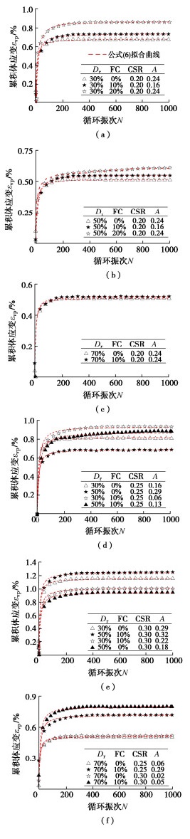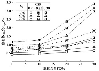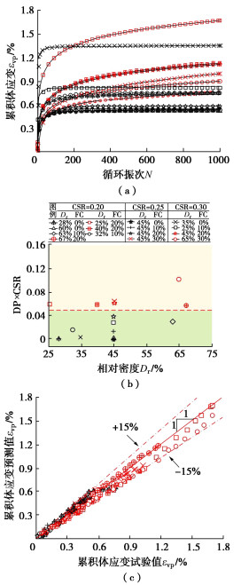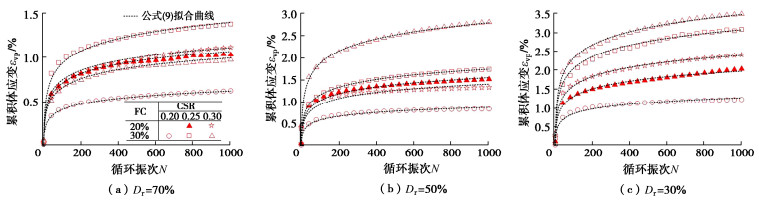 Dr and cyclic stress ratio CSR on its deformation characteristics, a series of cyclic drainage loading tests are carried out on the specimens of Nansha islands using the GDS dynamic triaxial instrument. The test results show that the development rate and the degree of deformation of cumulative volumetric strain