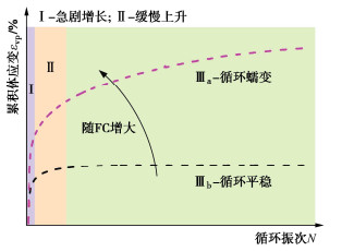 N relationship curve of the saturated coral sand shows two development modes, cyclic smoothness and cyclic creep. The potential damage factor DP is introduced to characterize the influences of FC on the development pattern of
