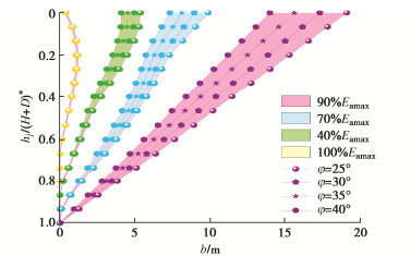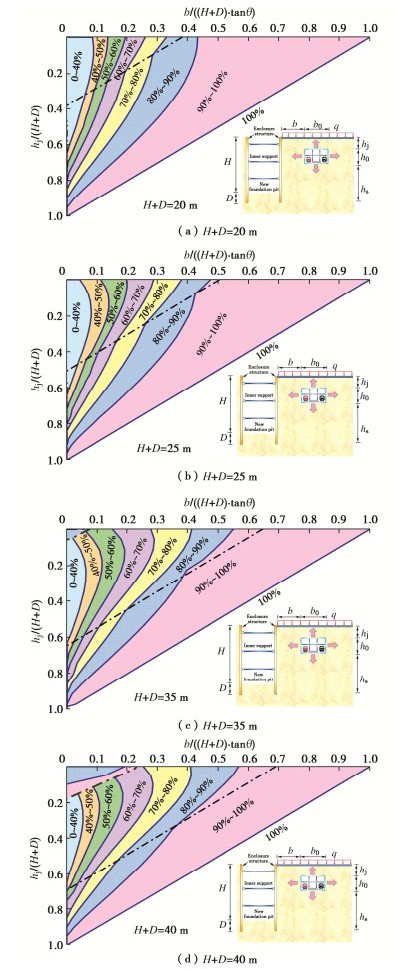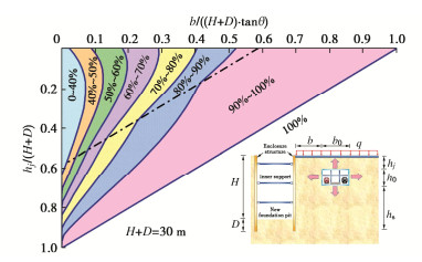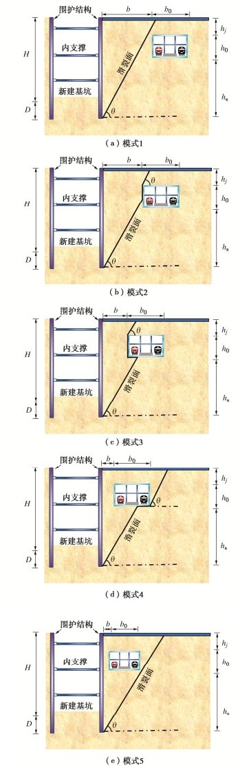 Aiming at the problem of complex formula for calculating the resultant force of active soil pressure of limited soil, based on the newly built excavations in the vicinity of subway stations, multiple limited soil failure modes are proposed based on the positional relationship between the existing subway stations and the excavations. The thin-layer microelement method is used to consider the frictional effects between the soil and the structural interface, and a method for calculating the combined force of active soil pressure is established. By adjusting the spatial position relationship between the newly built and existing structures, an active soil pressure contour map is obtained, and the parameter analysis is conducted. Furthermore, a simple calculation method for active soil pressure is put forward. The research results indicate that: (1) Five finite soil failure modes are proposed, and the corresponding formulas for calculating the active soil pressure are established. (2) As the proximity distance increases, the active soil pressure gradually increases. As the thickness of the existing subway station cover increases, the active soil pressure gradually increases when approaching the excavation, and the active soil pressure on the side far from the excavation pit first increases, then decreases, and finally increases. (3) The depth of the excavation has a significant impact on the active soil pressure, the internal friction angle has an impact on the active soil pressure, and the wall-soil friction angle has basically no effect on the active soil pressure. (4) The value of the spatial position relationship coefficient of the combined force of active soil pressure is given. Through the above research, a simple method for the combined force of active pressure of limited soil is proposed to provide reference for the design and construction of adjacent projects.