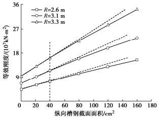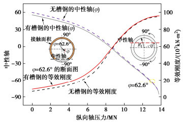 To accurately and quickly predict the effects of longitudinal channel steel reinforcement technology on the equivalent stiffness of a shield tunnel, the theoretical researches are conducted on the longitudinal channel steel reinforcement technology. A new analytical solution is proposed for the equivalent bending stiffness of the shield tunnel under the combined action of longitudinal channel steel and axial force. The solution can be degenerateed into a special case without longitudinal channel steel, and it is validated those the classical theory, model tests and numerical simulation. The results show that the neutral axial