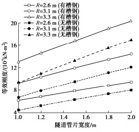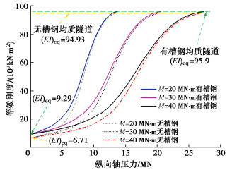 φ of the shield tunnel decreases with the increasing longitudinal channel steel and longitudinal axial force, directly affecting the contact state between tunnel segments, which will impact the equivalent stiffness of the shield tunnel. The equivalent stiffness of the shield tunnel increases nonlinearly in an S-curve with the longitudinal axial force and decreases with the increasing bending moment, which is directly proportional to the width of tunnel segment, the number, elastic modulus and sectional area of channel steel. The influential order on the equivalent stiffness of the shield tunnel is the number, sectional area and elastic modulus of longitudinal channel steel. The influence mechanism of sensitivity parameters of longitudinal channel steel on the equivalent stiffness of tunnels is theoretically explained, which enables accurate and quick prediction of the reinforcement effects of longitudinal channel steel.