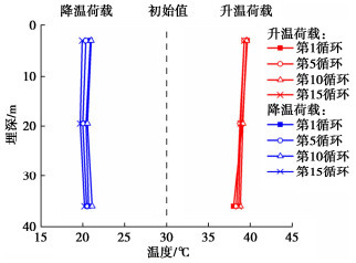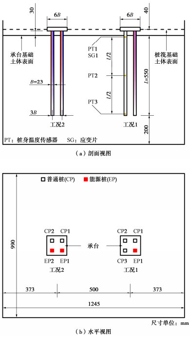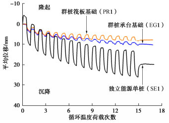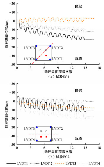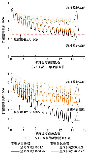 During the operation of energy pile-based ground source heat pump systems, the energy piles may experience non-symmetrical temperature changes, resulting in inclination of pile group. This can affect its serviceability unfavourably. By conducting centrifuge tests, the inclination of 2×2 energy pile groups in sand induced by non-symmetrical cyclic thermal loading is quantified. During each test, 15 two-way thermal cycles with an amplitude of 10 ˚C are applied while maintaining a constant vertical load. A total of 10 tests are carried out to evaluate the effects of the distribution of energy piles within the group, magnitude of vertical load and raft-soil interaction on the inclination of pile groups. The results show that the inclination of pile group accumulates with thermal cycles at a reducing rate. Under normal vertical load (FoS = 2.0), the accumulated inclination is about 1.8‰, less than 2.5‰ as specified by the China design code. The redistribution of axial load occurs with the maximum increase of about 40% of the initial value. As the vertical load increases, the accumulated inclination can exceed 2.5‰. The inclination of pile group induced by non-symmetrical cyclic thermal loading should be well considered at the design stage.