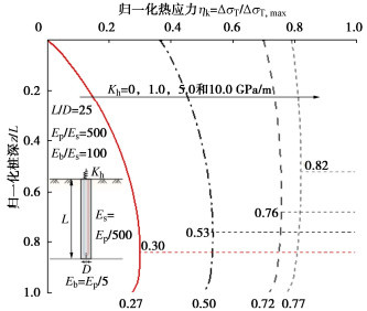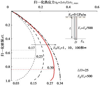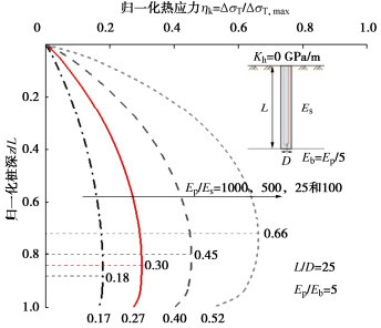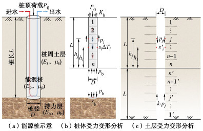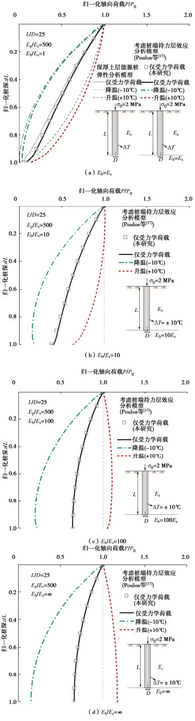 As a new type of energy-saving technology, the energy piles have received increasing attention due to their dual functions of load bearing and heat transferring. The application of thermal loads poses new challenges for the design and serviceability performance of the energy piles. However, in the existing theoretical studies, the stress-deformation characteristics of the energy piles subjected to the combined thermomechanical loading under different bearing conditions have not been fully revealed. In this study, an analytical model for the energy piles under different bearing conditions is established based on the framework of the elastic analysis theory, taking into account the effects of the end-bearing layer. The model is validated against the field test data. This study focuses on analyzing the effects of geotechnical conditions and geometrical parameters of the piles on the load transfer and displacement behavior of the energy piles. The results show that the thermally induced axial loads increase with the stiffness of the bearing layer. Compared to the floating-bearing piles, temperature variations will cause greater thermal stress in the piles bearing on stiff soil strata. The stiffnesses of the end-bearing layer, surrounding soil and pile head are the critical factors affecting the magnitude and distribution of the thermally induced stress and displacement. The normalized calculated results obtained from the analytical model can be used to estimate the thermally induced stress and displacement of the energy piles in practice and provide a reference for the design and calculation of the energy piles under different bearing conditions.