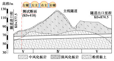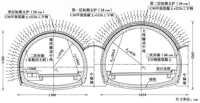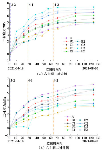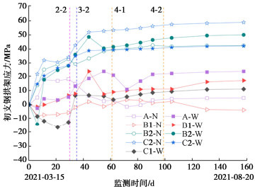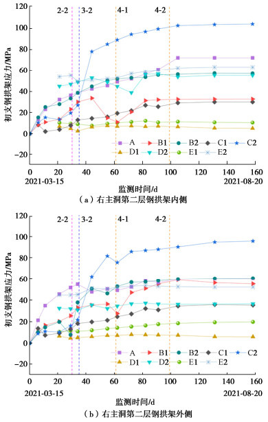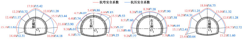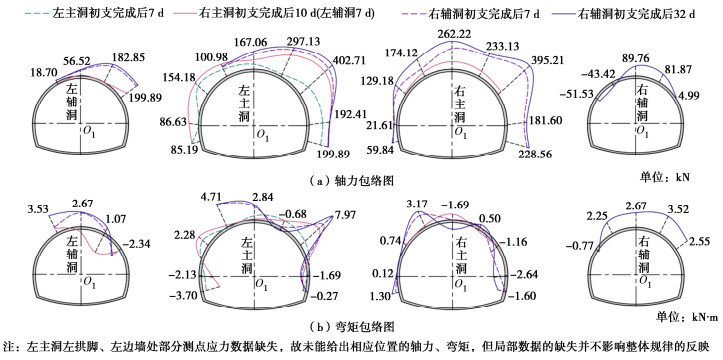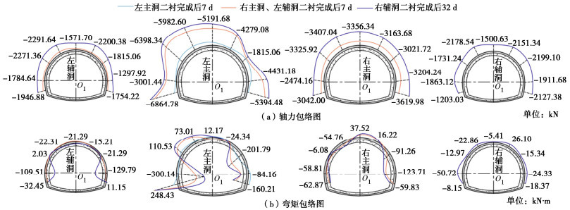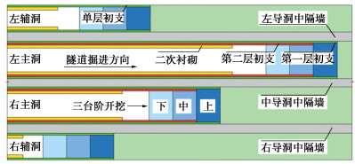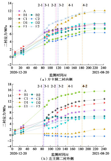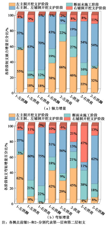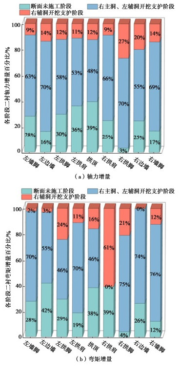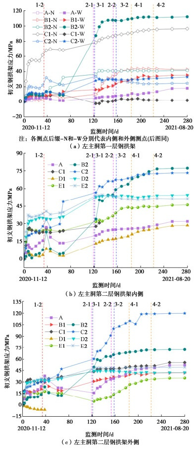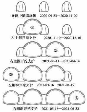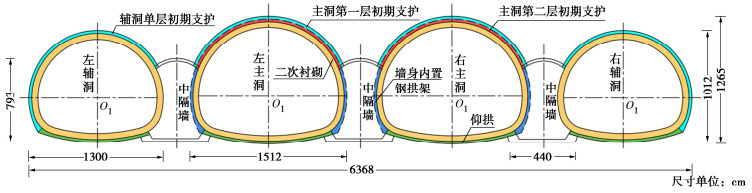 • 摘要: 多连拱隧道开挖洞室多、跨度大,施工过程中荷载转换频繁,支护结构受力特征复杂,对多连拱隧道支护结构受力开展现场测试研究具有重要意义。依托长沙观音岩不等跨四连拱隧道工程,选取典型断面对各洞室初支钢拱架、二次衬砌结构进行施工全过程应力监测,以获得复杂施工步序下支护结构受力特征。测试结果表明:观音岩隧道施工中,先行主洞较后行洞室承担的围岩压力更大,右主洞、左右辅洞开挖顺序居后,施工扰动次数较少,支护结构内力较小;各洞室中,初支钢拱架内力整体均呈“左小右大”的非对称分布特征,其最大轴向压力402.71 kN、最大弯矩7.97 kN·m出现在左主洞的右拱脚处,二衬内力整体非对称程度较低,只以左主洞呈显著非对称分布,其余洞室呈整体对称分布;先行左主洞支护结构的内力扰动主要由受后行邻洞的开挖影响所产生,后行右主洞、左辅洞开挖支护阶段,左主洞初支钢拱架、二衬结构绝大部分位置其内力增量超过总增量的一半;采用“先主后辅,左主先行”施工方案,施工全过程支护结构的安全性均满足规范要求,支护结构设计和施工措施合理。研究成果可为复杂条件下多连拱隧道的设计与施工提供借鉴。