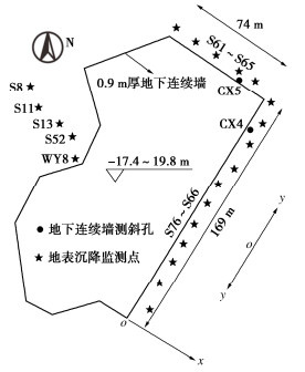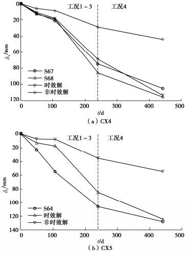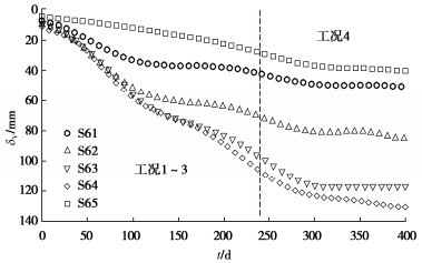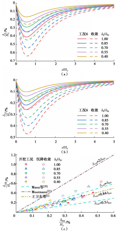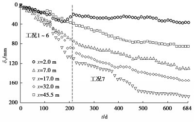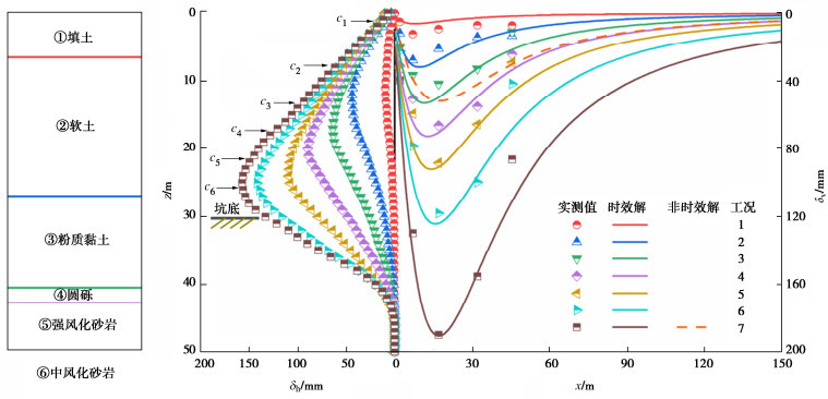 By comparing the theoretical and measured results, it is observed that the current methods need to be revised in predicting the ground settlements induced by excavations in soft clay with a significant creep effect. Using the Lame equation and three-parameter viscoelastic foundation model, a time-dependent semi-analytical solution is derived for the ground settlements induced by arbitrary wall deflections. The solution is implemented in two excavations in Hangzhou soft clay, in which the development rules of the ground settlements from the soil excavation to basement construction are analyzed. The results indicate that: (1) The soft soil creep induces the ground settlements independently of the extra wall deflections, leading to a higher ratio of the maximum ground settlement to the maximum wall deflection during soil excavation compared to an excavation in non-soft clay. Furthermore, it results in continuous ground settlements during basement construction. (2) The ground settlements induced by the soft soil creep increase with wall deflections, showing the concave settlement mode. (3) The ratio of the maximum ground settlement to the maximum wall deflection of deep excavations in soft clay is primarily influenced by the creep characteristics of soft soil and construction duration, which appear unaffected by the wall deflections.
