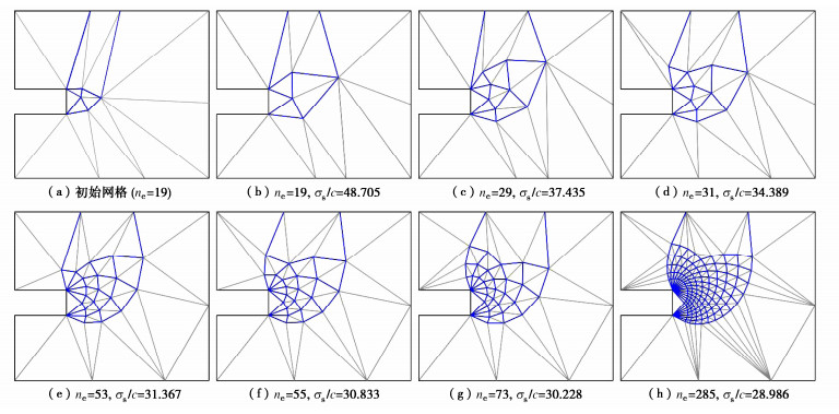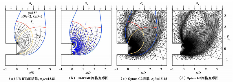 c and obtain the slip line failure modes. The results show that the range affected by the failure modes and the major failure domain are given by both the UB-RTME slip line mesh and the Optum G2 adaptive encryption mesh. The range of failure area is determined by the effective discontinuities and element velocity characterized by the UB-RTME. The quantitative data of the failure area
