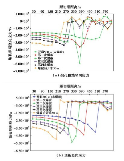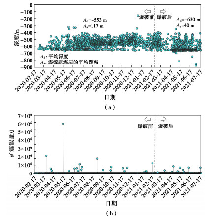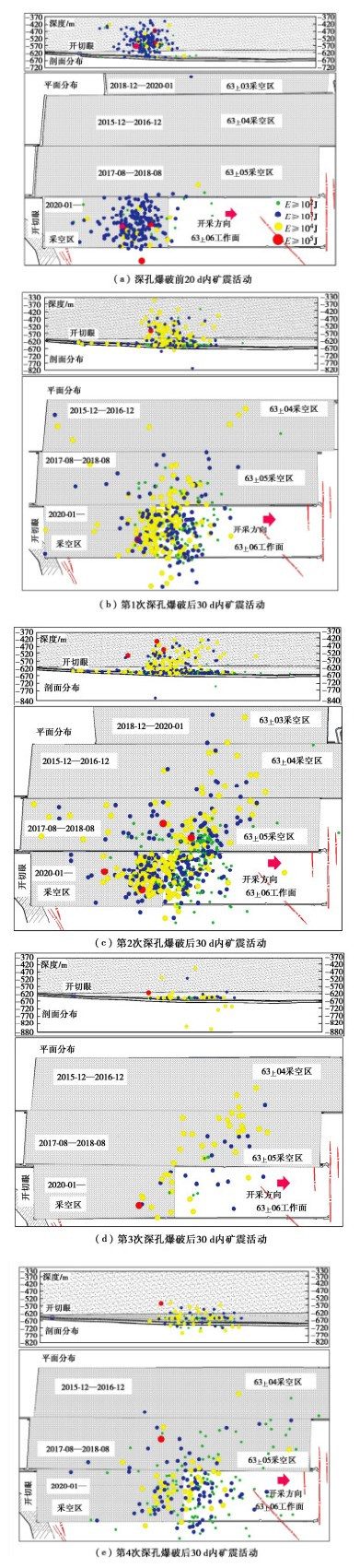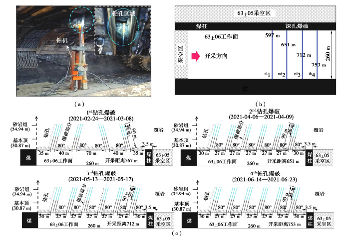 Most of the coal mines in East China, Northeast China and North China have been mined below 600 m in depth, and dynamic disasters such as mine earthquakes have occurred frequently, which have seriously restricted the safety, green and efficient production of coal mines. In view of the frequent occurrence of mine earthquakes under thick and hard roofs in deep coal mines in China, this study takes Dongtan coal mine as an example, and uses the methods of field monitoring, theoretical analysis and numerical simulation to elaborate the effects of deep-hole blasting roof pressure relief on the prevention and control of mine earthquakes, the pre-cracking mechanism and the influences on the overburden activities during mining process. It is found that the deep-hole blasting technology can effectively weaken the thick and hard overlying strata, release the strain energy accumulated in the overlying strata, and reduce the risk of large energy mine earthquakes. Based on the theoretical analysis of rock failure zone under explosion loads, the rock fracture zone, fracture zone and effective failure range of deep-hole blasting are calculated. Combined with the monitoring of working face support, the deep-hole blasting technology can actively regulate the mine pressure and avoid the appearance of strong mine pressure. The numerical simulation model for the whole process of coal seam mining with four deep-hole blastings is established, and the evolution characteristics of stress and displacement of overburden before and after blasting are analyzed. In addition, the influence mechanism of the deep-hole blasting on the overburden activity during mining is revealed. The pressure relief technology of broken roof by the deep-hole blasting can effectively weaken the thick and hard roof above the coal seam, reduce the compressive strength of thick and hard roof and increase the coefficient of crushing and swelling of overburden, which can be used to prevent and control the occurrence of strong mine earthquakes in deep mining.