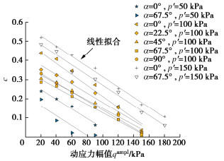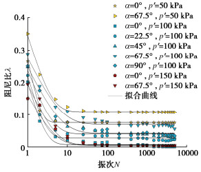 α = 67.5°, the dynamic elastic modulus of the sample is the smallest, and the dynamic elastic modulus decreases rapidly when the amplitude of the cyclic vibration load increases to the critical dynamic stress. According to the characteristics of the damping ratio changing with the number of vibrations, an expression model considering the characteristics of the attenuation rate, initial damping ratio and stable damping ratio is proposed, and the influences of dynamic stress amplitude and confining pressure on the variation of damping ratio are analyzed. The research results are of great significance for revealing the anisotropy of the mechanical properties of fissured expansive soils under dynamic loads and ensuring the safe operation of railway routes and rail transits in expansive soil areas.