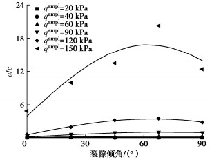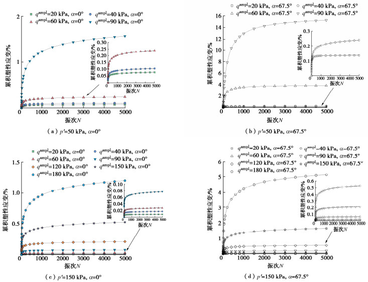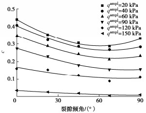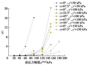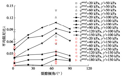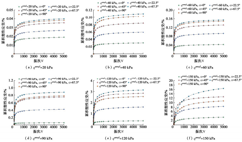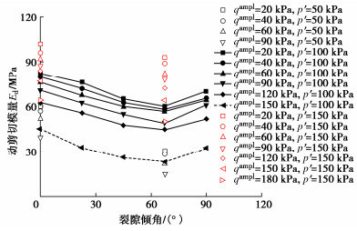 α=0°, 22.5°, 45°, 67.5° and 90°) in the PiShihang Irrigation Area of Anhui Province as the research object, the unidirectional cyclic load tests are carried out on the soil by using the GCTS dynamic and static true triaxial instruments. The effects of fissure inclination, confining pressure and different dynamic stress amplitudes on the characteristics of the cumulative plastic strain, dynamic elastic modulus and damping ratio of expansive soil are studied. The test results show that as the amplitude of cyclic loading increases, the cumulative strain of the samples with the same fissure angle increases continuously. Among the studied five fissure angles, the sample with