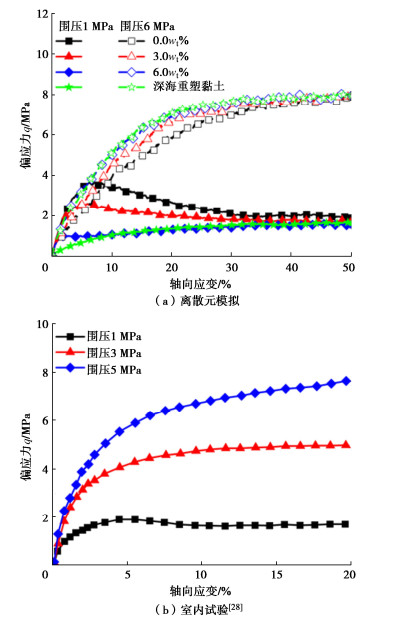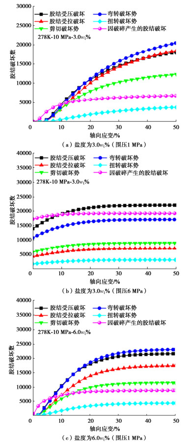 The mechanical behavior of methane hydrate bearing soil is closely related to the characteristics of hydrate phase equilibrium. Compared with sand, clay has smaller pore size and the pore size has a great influence on the characteristics of hydrate phase equilibrium. A three-dimensional thermal-hydro-mechanical-chemical bond contact model for grain-cementing type methane hydrate-bearing clay is established by introducing the influences of the pore size on the phase equilibrium line. The numerical simulation of triaxial compression tests on the methane hydrate-bearing clay under different salinities is carried out. The macro- and micro-mechanical behaviors such as stress-strain curve, volume strain, number of bond breakage, aggregate crushing rate and strength characteristics are analyzed and compared with the mechanical properties of remolded clay. The enhancement of bond on the mechanical properties of the methane hydrate-bearing clay is discussed. The results show that (1) Under low confining pressure, with the increase of the salinity, the peak shear strength of the methane hydrate-bearing clay gradually decreases, and the strain softening is less significant. At the same time, the volume strain shows shear contraction first, then weak dilatation and then shear contraction. Under high confining pressure, it shows strain hardening and shear contraction. (2) With the increase of the confining pressure and salinity, the number of bond breakage and the aggregate crushing rate of the methane hydrate-bearing clay gradually increase. (3) Finally, through the analysis of the strength characteristics of the methane hydrate-bearing clay, it is found that its strength envelope presents typical nonlinear characteristics.