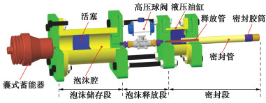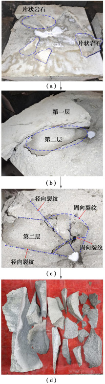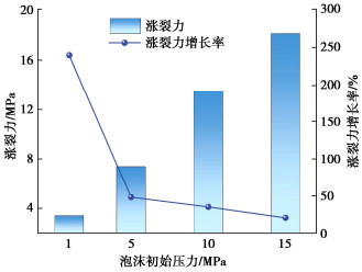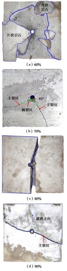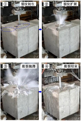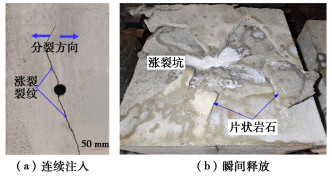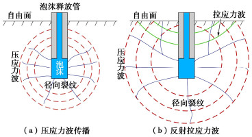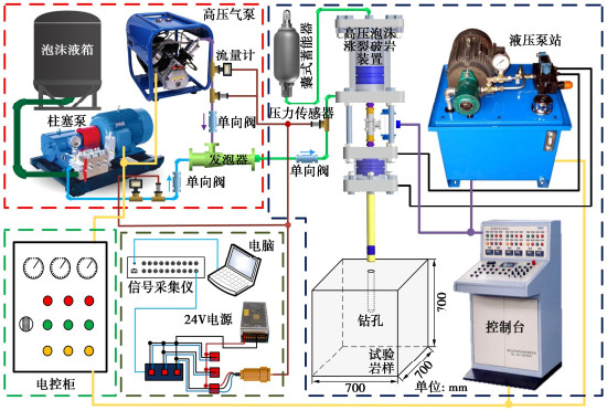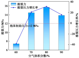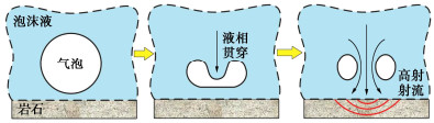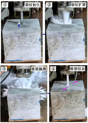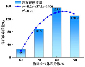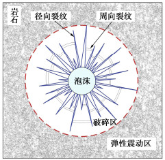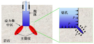 In view of the shortcomings of the drilling and blasting method and the mechanical method in rock breaking engineering, based on the high viscosity and compressibility of foam, the rock-fracturing technology by high-pressure foam is proposed. Firstly, the rock fracturing devices by high-pressure foam are designed, the process of high-pressure foam instantaneous release to boreholes is theoretically analyzed, and then the testing devices for rock fracturing force by high-pressure foam are built and the relevant experiments are carried out. By using the developed experimental system of rock fracturing by high-pressure foam, the foam-fracturing characteristics with different air volume fractions are investigated, and the mechanism of high-pressure foam fracturing is revealed. The results show that when it is released, the high-pressure foam can produce a higher fracturing force than the initial foam pressure, but the fracturing force increases and then decreases with the increase of the air volume fraction of foam. The high-pressure foam fracturing goes through four stages of crack initiation, crack expansion, crack separation and end of cracking. The rock-breaking weight increases and then decreases with the increase of air volume fraction. When the air volume fraction is 60%, the rock-breaking form is blasting crater, which is mainly caused by the tensile stress generated by the compressive stress waves reflected on the rock upper surface. When the air volume fraction is 70%~90%, the rock-breaking form is stripped large stones, which is mainly caused by the effects of the stress concentration at the bottom of boreholes.