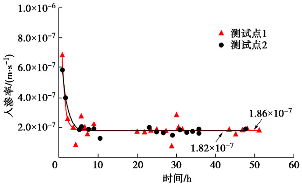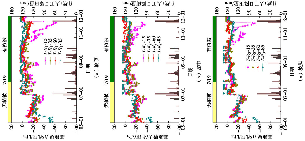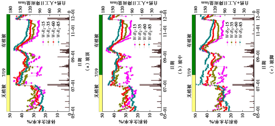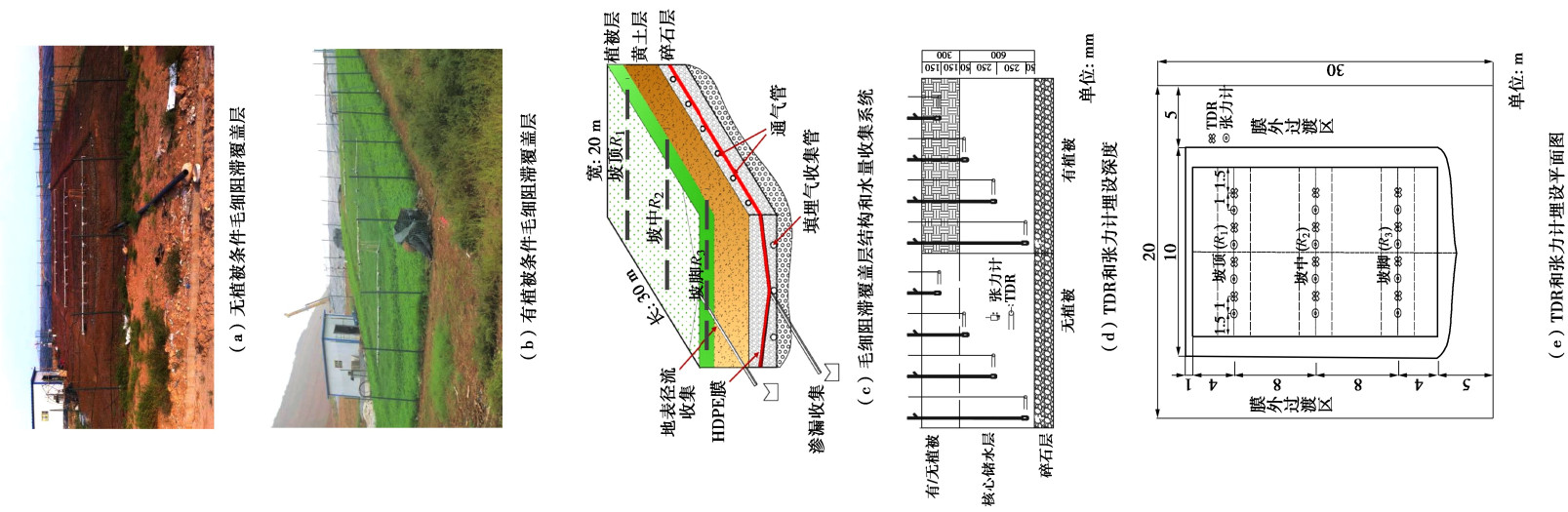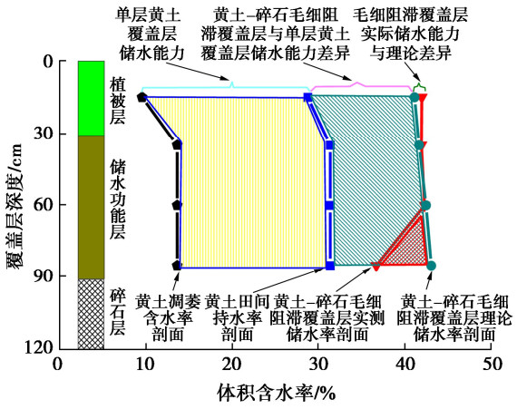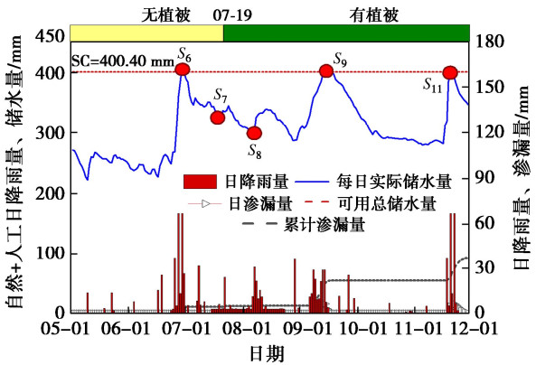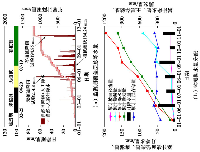 To investigate the service behavior and water-storage capacity of capillary barrier cover systems in semi-humid areas of northwest region of China, a full-scale cover system is constructed in Xi'an, and the rainfall and long-term serviceability monitoring tests are conducted. The results show that: (1) Under lush vegetation growth in summer, the water release rate with vegetation is significantly higher than that without vegetation, with the former (45.80 mm) being 1.73 times greater than the latter (26.55 mm). (2) Under light to moderate rainfall conditions in the northwest region, the measured water-storage capacity is approximately 93% of the theoretical one. The soil cracks and other preferential flow pathways have the minimal impact on the impermeability performance, with leakage primarily occurring when the actual water-storage capacity exceeds the theoretical value. During short bursts of heavy rainfall, the measured water-storage capacity is approximately 73% to 84% of the theoretical one. The soil cracks preferentially infiltrating are a common and frequent induction mechanism for leakage in the soil cover layer. This may result in the inadequate utilization of water-storage capacity of soil. It is suggested that a safety margin coefficient of 1.1 to 1.3 should be considered to enhance impermeability.