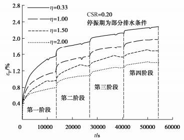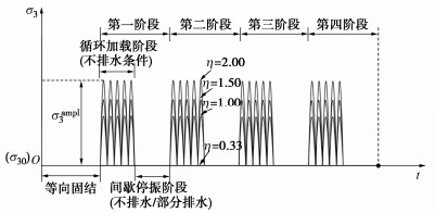 Traffic loading is composed of cyclic loading and intermittent periods, in which the influences of intermittent period on the dynamic characteristics of soil cannot be ignored. The stress field in subgrade soil caused by the traffic loading includes cyclic deviator stress and cyclic confining pressure. Therefore, a series of cyclic triaxial tests in intermittent cyclic loading mode with cyclic confining pressure are carried out to study the deformation behaviors of saturated clay, and the effects of the cyclic confining pressure and drained conditions during the intermittent period are investigated. The results show that the relationship between the accumulated axial strain increment and the loading stages are similar under different test conditions: the accumulated axial strain increment gradually decreases as the loading stage increases. Additionally, the variation of the accumulated axial strain increment is also affected by the cyclic confining pressure, in which the accumulated axial strain increment decreases with the increasing cyclic confining pressure. Besides that, the variations of accumulated axial strain are also different under different drained conditions during the intermittent period: the excess pore water pressure induced in cyclic loading period dissipates under partially drained conditions during the intermittent period, leading to that the accumulated axial strain of soft clay increases in a certain extent during the intermittent period; part of the deformation produced during the cyclic loading period can recover under undrained conditions during the intermittent period, and the accumulated axial strain of soft clay decreases. The above test results may deepen the understanding of the deformation behaviors of soft clay under intermittent cyclic loading.