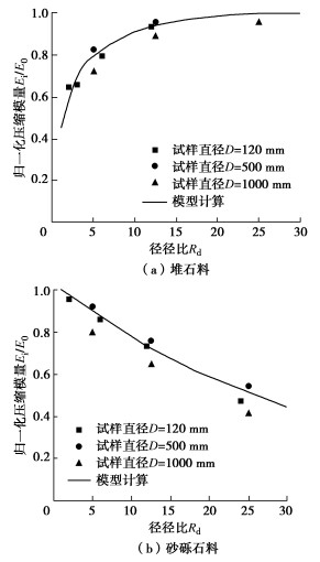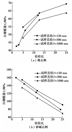 With the development of dam construction towards higher dams and larger storage capacity, the dam materials are also developing towards larger particle sizes. However, due to the limitations in conditions and scale, the soil tests need to be conducted in a scaled form, which has led to the issues related to size effects. In this study, a size effect model for the deformation characteristics of dam soil and stone materials is derived and established taking into account the factors such as particle breakage, lateral deformation, dry density and load level. A series of compression experiments are conducted on two typical types of dam building materials, rockfill and gravel with sample sizes ranging from 120 to 1000 mm, revealing the correlation between the size effects of diameter to diameter ratio and crushing rate. The research results indicate that the particle breakage rate decreases with the increase of the diameter to diameter ratio, the compression modulus decreases with the increase of the particle breakage rate, the deformation modulus of the rockfill materials increases with the increase of the diameter to diameter ratio, and the compression modulus of the gravel materials decreases with the increase of the diameter to diameter ratio. The experimental results are consistent with the the calculated ones by the model, proving that the proposed model is of certain applicability and rationality.