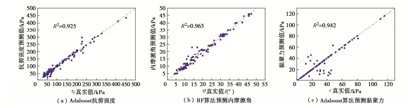 R2) and absolute value error (MAE). The Adaboost algorithm is employed for the sensitivity analysis of input parameters. The findings indicate that the Adaboost algorithm yields the best generalization for the shear strength the RF for the internal friction angle, and the Adaboost algorithm for the cohesion, achieving respective test-set