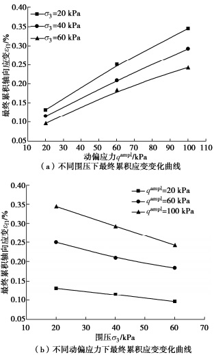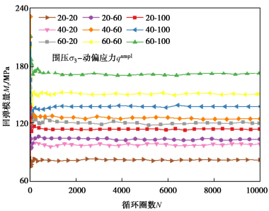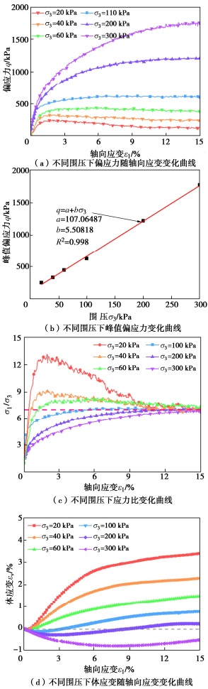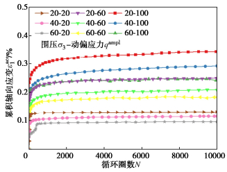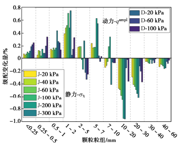 • 摘要: 粗粒土因其良好的力学性能被广泛应用于路基建设中,但长期荷载作用下填料的变形严重影响了道路结构的安全运营。为了揭示典型路基应力水平及交通荷载条件下粗粒土的变形及强度演化,开展了一系列粗粒土填料静动力学特性试验,并进一步分析了静动力作用下填料破碎特征及差异。研究表明,低围压情况下,较小的轴向应变就可以使材料达到峰值应力状态,且围压的增加可显著提升填料峰值强度。不同围压下,填料在剪切过程中均出现剪胀现象,其中围压小于300 kPa试样的最终体应变均大于0。在动力试验中,填料轴向累积应变在相同加载次数下随着动偏应力的增加而增大,随围压的增加而减小,且前500次加载所造成的轴向应变占总应变的80%。静动力作用下的填料颗粒破碎形式存在差异,静荷载作用下的颗粒破碎主要以边角及整体断裂为主,而动荷载下主要以表面研磨和边角轻微断裂为主。