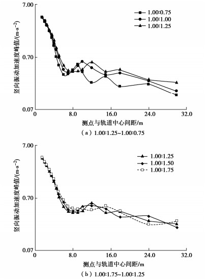 • 摘要: 基于巴黎—布鲁塞尔高铁某路堑段地面环境振动现场实测,分析路堑段地面振动特性与传播衰减规律。基于2.5维有限元法基本原理,推导并建立高铁荷载下路堑段2.5维有限元动力计算模型,讨论了路堑设计参数对地面振动特性的影响。结果表明:近轨道处地面振动幅值主要受列车轴重影响,而距轨道较远处则由中间车相邻转向架轮对的叠加效应主导。路堑段地面环境振动随与轨道距离的增加而减小,中高频振动的衰减速率大于其他频段。地面振动1阶主频主要由列车荷载的基频f1主导。路堑段地面环境振动随与轨道距离的衰减过程大致可分为3个阶段,且在堑顶处有较明显的振动局部放大现象。同时,随路堑深度增加,地面振动逐渐减小,当超过某一限值后,继续增加路堑深度难以有效减小地面振动。此外,在确保稳定性的前提下,较陡的路堑边坡更有利于减小高铁运行引起的地面振动。