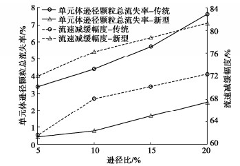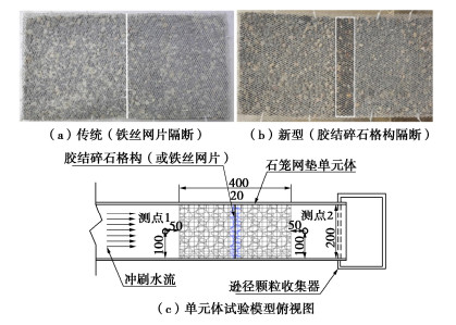 The traditional gabion mesh mats use the mesh as the partition, which requires a lot of manpower to construct. A new type of gabion mesh mats is designed with cemented gravel latticework as the partition to save labor and shorten the construction period. The scouring tests of two types of gabion mesh mats units are carried out. The characteristics of inferior-diameter ratio (IDR) particle loss, flow rate slowing down and washed-out area with IDR between the traditional and new gabion mesh units are analyzed and compared. The scouring tests on the new type of gabion mesh units with different numbers of cemented rubble lattice partitions under the same size are further conducted. The test results show that loss of the inferior-diameter particles, the ability to slow down the scouring flow rate and the erosion area of traditional and new gabion mesh units increase with the increase of the inferior-diameter ratio. The better inferior-diameter ratio is betwwen 10% and 15% for the traditional gabion mesh, and between 10% and 20% for the new gabion mesh. For the same size of test unit, when the number of cemented gravel lattice partitions in the new gabion mats increases from 1 to 2, the loss of inferior-diameter particles and the erosion area can be reduced significantly. The increase of the number of cemented gravel lattice partitions has no significant reduction effects. The test results may provide a reference for promoting the design and construction of new gabion mesh riparian structures.