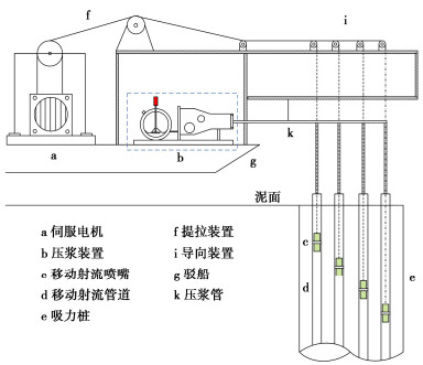 The suction caisson foundation has been favored by many engineers due to its advantages such as wide size range, large ultimate water depth, good economy and convenient construction. However, the horizontal and vertical bearing capacities of suction caisson foundations are relatively low in soft clay. There is still no effective method to improve the bearing capacity of the suction caisson foundations. In order to effectively improve the bearing capacity of the suction caisson foundations, the mobile jet reinforcement technology and the form of rigid composite suction caisson foundation are innovatively proposed. The bearing characteristics of a suction caisson foundation reinforced by the mobile jet technology are studied through the model tests. The results shwo that the horizontal bearing capacity of the rigid composite suction caisson foundation is about 2.5~4.0 times higher than that of the ordinary caisson. The uplift bearing capacity of the rigid composite suction caisson foundation is about 3.5~5.0 times higher than that of the ordinary caisson. The propesed method increases the contact area between the pile and the soil and enhances the strength of the soil around the pile. The cement slurry evenly wraps around the caisson and the grouting effects are satisfactory. The jet parameters and soil characteristics need to be considered in the design of the new suction caisson foundation. It can provide reference for the engineering application of the mobile jet reinforcement technology and the theoretical analysis of the rigid composite suction caisson foundation.