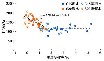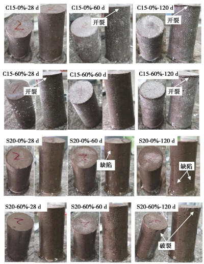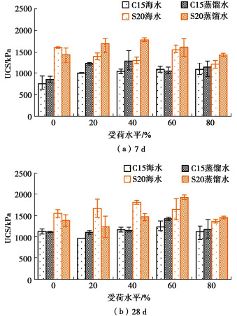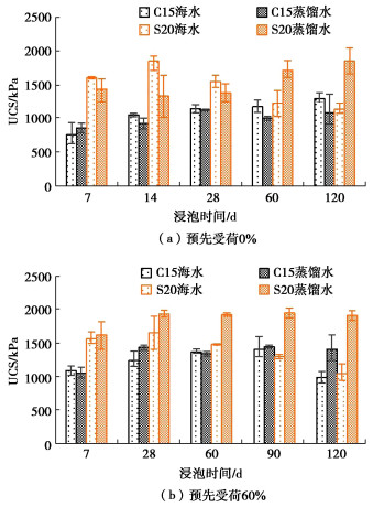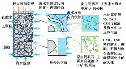 • 摘要: 为研究受荷和海水侵蚀共同作用对工业废渣固化土强度的影响,对受到不同预先荷载水平的碱渣-矿渣-电石渣固化土进行海水侵蚀模拟,开展侵蚀试样无侧限抗压强度和X射线衍射等测试,并与水泥固化土和蒸馏水浸泡环境对比,重点探讨预先受荷水平和侵蚀龄期的影响规律及机理。结果表明:随着预先受荷水平的增加,固化土强度呈先增后减趋势,当预受荷载为40%或60%时强度达到最大,荷载为80%、海水侵蚀时强度降低;当预先受荷水平为60%、海水侵蚀120 d时,碱渣-矿渣-电石渣和水泥固化土的强度分别为侵蚀前强度的60%和84%;较高荷载和海水长期侵蚀生成较多次生钙矾石和水化氯铝酸钙等物质导致固化土性质劣化,对固化土强度产生显著的不利影响。