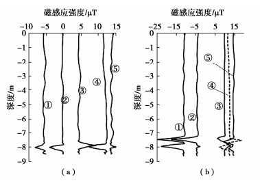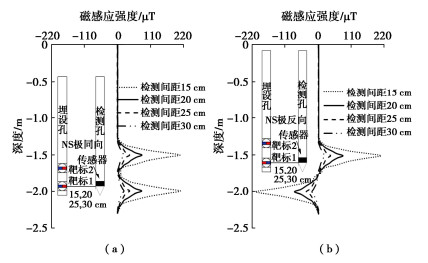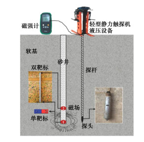 The setting depth of bagged sand well is a technical index to be controlled in the treatment of soft foundations by the drainage consolidation method. It is of great significance to develop an effective method for in-situ testing the depth of bagged sand wells to ensure the treatment effects of the drainage consolidation method. The results show that the average consolidation degree of soft soil foundation is approximately linearly positive correlated with the depth of bagged sand well. The artificial magnetic field set in the sand bag as the detection mark of the end of the bagged sand well has significant recognition. The detection target preset at the bottom of the sand bag has a good success rate when the sand bag is set to a predetermined depth. By controlling the magnetic field strength of the magnetic core in the target and the distance between the two cores, the influences of the natural magnetic field and adjacent targets can be avoided. It has good maneuverability and accuracy to detect the spatial position of the target synchronously with the penetration magnetic sensors in the static penetration mechanical system. The field tests show that the magnetic field method can meet the engineering needs and has a significant cost performance advantage compared with the high pressure water flushing method.