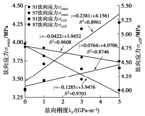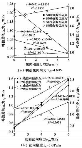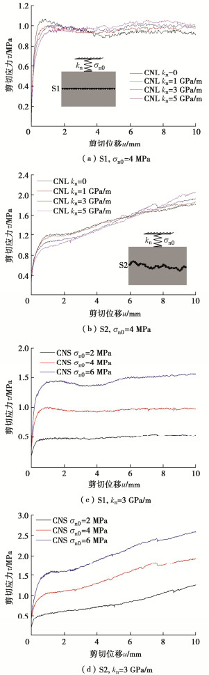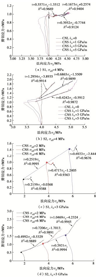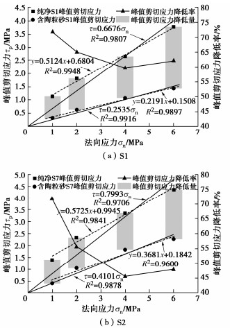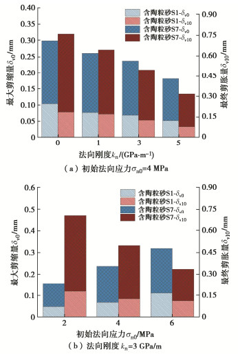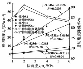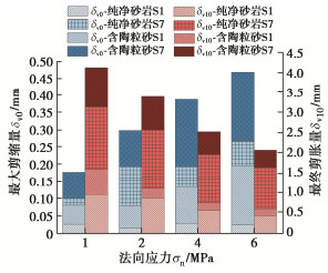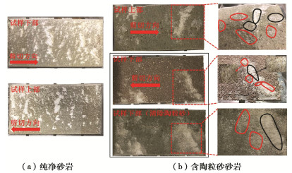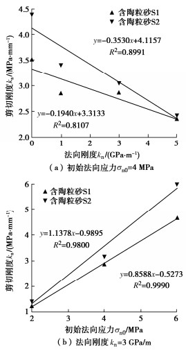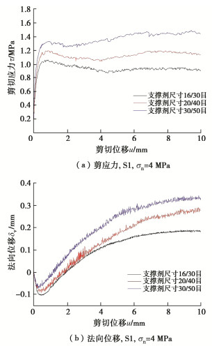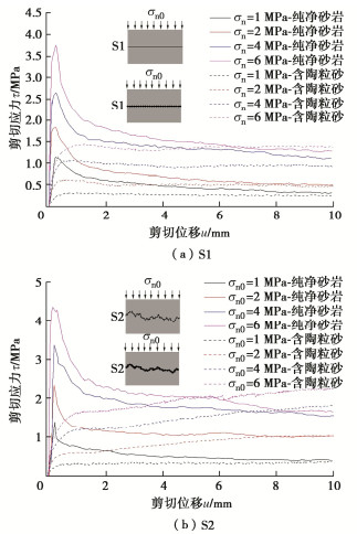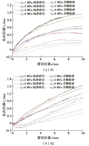 The shear behavior of sandstone fractures filled with proppant has an important impact on tight gas production. In this study, the effects of normal stresses (1~6 MPa), normal stiffnesses (0~5 GPa/m), initial normal stresses (2~6 MPa) and proppant sizes (16/30 mesh, 20/40 mesh and 30/50 mesh) on the shear behaviors of ceramic proppant-infilled sandstone are revealed through the direct shear tests on two kinds of rough sandstone under the constant normal load (CNL) and constant normal stiffness (CNS) boundary conditions. The results indicate that after adding proppant, the peak friction angle, the shear stiffness and the peak shear stress of fracture decrease, the shear contraction increases and the shear dilation decreases. With the increase of the normal stress, the shear strength increases. Under the constant normal stiffness boundary, with the increase of the normal stiffness, the residual shear stress increases, but the peak shear stress, the final shear dilation and the apparent friction angle decrease. With the increase of the initial normal stress, the peak shear stress, the residual shear stress and the shear stiffness increase, and the variation range is higher than that of the normal stiffness. The increase of the initial normal stress inhibits the shear dilation of the fracture surface, and increases the apparent friction angle of the fracture. With the decrease of the proppant size, the shear strength increases and the dilatancy displacement increases.