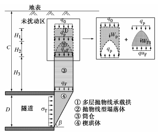 For the deep-buried shield tunnels in dry cohesionless soils, it is critical to determine the support pressure acting on the tunnel face due to the significant soil arching effects. Based on the limit equilibrium method and the wedge theory, a multi-layer parabolic bearing arch model is proposed. According to the characteristics of failure zone of the tunnel face and the category of soil arch under different buried depths, the tunnel state is divided into shallow buried tunnel, transition tunnel and deep buried tunnel, respectively. By considering the continuity of the principal stress deflection angle and lateral earth pressure coefficient in the multi-layer parabolic bearing arch and assuming the parabolic bearing arch as a three-hinged structural arch with reasonable arch axis, the load transfer expression for the multi-layer parabolic bearing arch is derived in transition zone and deep buried zone respectively, and then the limit support pressure is calculated. By comparing the proposed model with the existing model, model tests and numerical model, the rationality of the limit support pressure and failure zone of the tunnel face obtained by the proposed model is verified. Finally, the influences of the internal friction angle on the boundary between shallow and deep burials and the limit support pressure are discussed through parameter analysis. This study may provide a theoretical basis for predicting the limit support pressure acting on the tunnel face in dry sand.