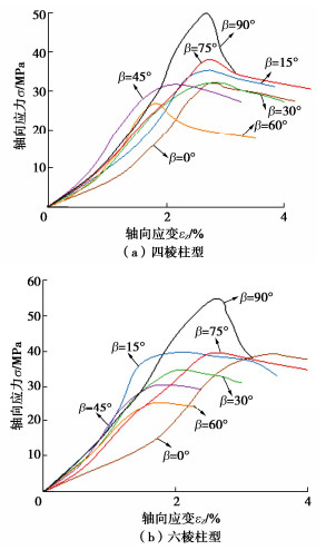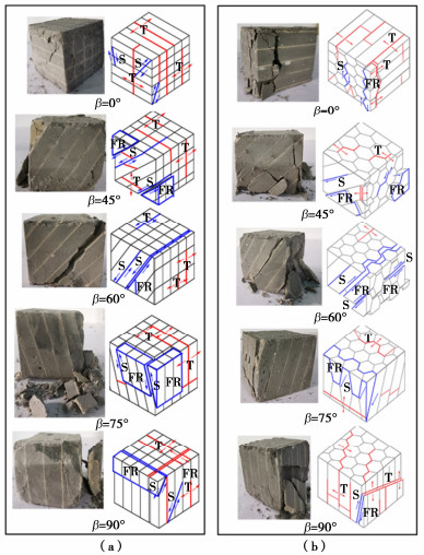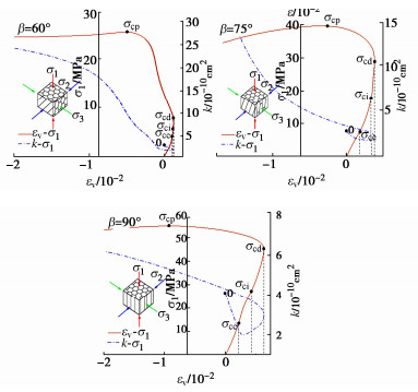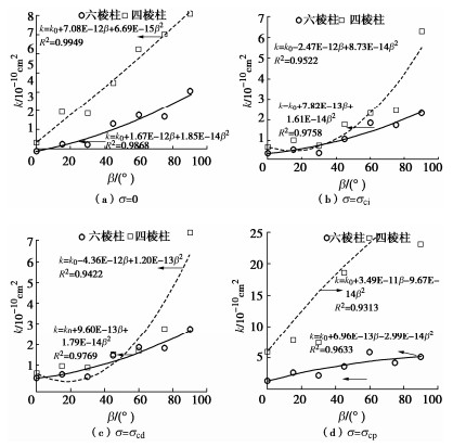 • 摘要: 随着以金沙江白鹤滩为代表的重大水电工程建设实践,掌握高围压、高水压为代表的复杂应力环境下工程岩体的力学及渗透性特征具有重要意义。以坝基岩体柱状节理玄武岩为研究对象,依据现场勘测数据及柱状节理岩体结构特征,制备了具有不同倾角β的四棱柱、六棱柱两种柱状节理相似材料模型试样,进一步开展真三轴应力-渗流耦合试验,试验结果表明:不同截面特征的柱状节理岩体均具有较强的渗透各向异性,不同加载阶段下的渗透系数kβ呈正相关性;在真三轴加载过程中,试样体积应变εV可作为k的有效表征参数,在体积压缩阶段k呈现较低水平,体积扩容阶段呈现快速增长趋势。试样最终破坏模式表现出3种典型形态,最危破坏模式为以节理面剪切滑移破坏为主的结构性破坏,主要出现于β为45°,60°试样中,因此在隧洞围岩及坝基岩体施工设计中应加强对该类岩体的侧向支护。